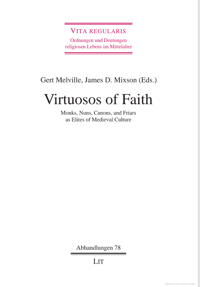 Virtuosos of Faith. Monks, Nuns, Canons, and Friars as Elites of Medieval Culture, éd. Gert Melville et James D. Mixson, Münster, LIT Verlag, 2020 (Vita regularis – Ordnungen und Deutungen religiosen Lebens im Mittelalter. Abhandlungen, 78). 340 p. ISBN : 978-3-643-91363-0. Prix : 48,97 euros.
