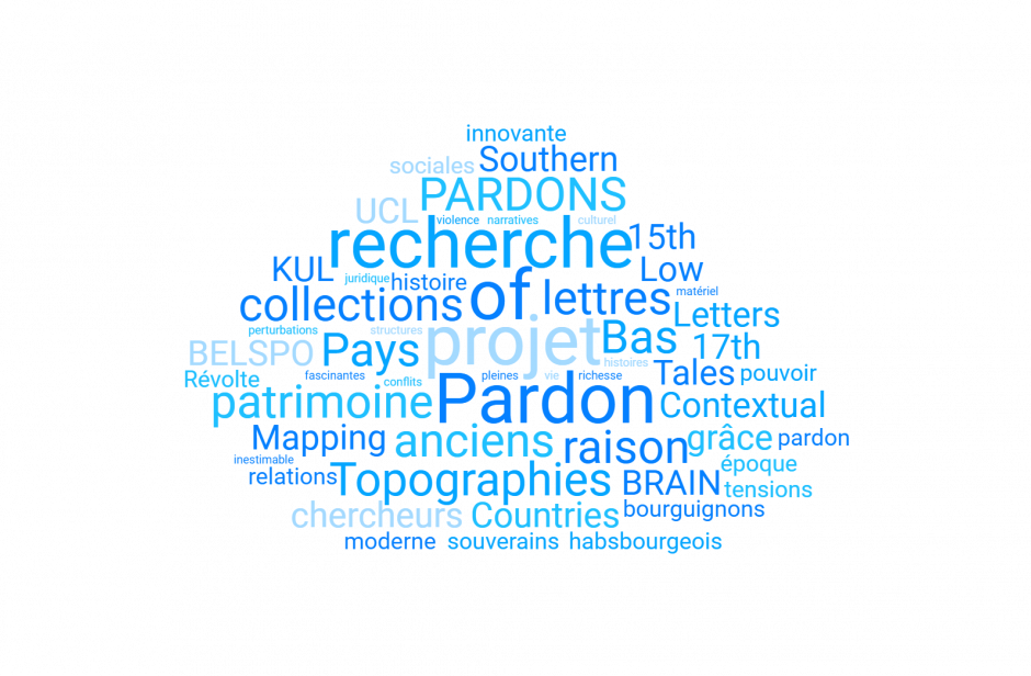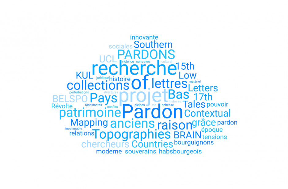 Le projet PARDONS (« Topographies of Pardon Tales: Contextual Mapping of Pardon Letters in the Southern Low Countries, 15th-17th c. ») est un projet de recherche de quatre ans, financé par le programme de recherche BELSPO BRAIN-be 2.0 et mené par une équipe de chercheurs des Archives de l’État de Belgique, de l’UCLouvain et de la KU Leuven. L’objectif de ce projet est de rendre publiquement accessibles les vastes collections de lettres de grâce accordées par les souverains bourguignons et habsbourgeois, accessibles aux Archives de l’État. Il s’agit de produire une histoire innovante du pouvoir et des relations sociales dans les anciens Pays-Bas à l’époque moderne, y compris lors de moments de tensions politiques et religieuses comme la Révolte néerlandaise. Ces milliers de lettres de pardon constituent l’un des éléments les plus importants du patrimoine archivistique des anciens Pays-Bas, non seulement en raison de la richesse de leurs structures narratives et de leur contenu juridique, mais aussi en raison de la période exceptionnellement longue qu’elles couvrent. Ces collections fascinantes, pleines d’histoires de violence, de conflits et de perturbations de la vie quotidienne, constituent une part inestimable du patrimoine matériel et culturel de la Belgique.