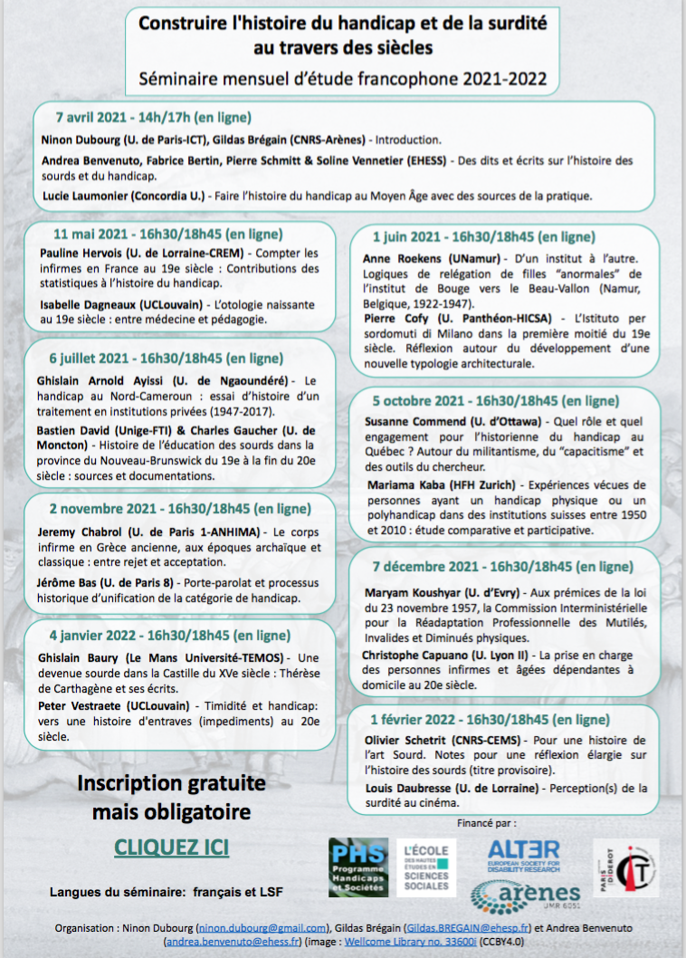 Les inscriptions à ce nouveau séminaire sont libres et gratuites, mais obligatoires sur ce site pour recevoir le lien pour la visioconférence : https://www.weezevent.com/construire-l-histoire-du-handicap-et-de-la-surdite-au-travers-des-siecles