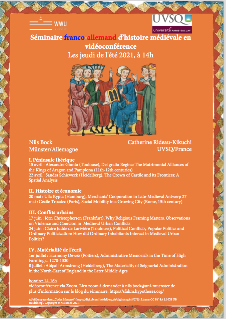 Diese Initiative steht einerseits in der Tradition einer Vortragsreihe, die seit 2009 am Lehrstuhl für Hoch- und Spätmittelalter/Westeuropäische Geschichte der Westfälischen Wilhelms-Universität in Münster unter dem Titel „Die junge Generation französischer Mediävisten zu Gast in Münster“ stattfand. Andererseits hat die Geschichte der Sozialwissenschaften lange Zeit den Austausch zwischen deutschen*e*s und französischen*e*s Forscher*innen begünstigt. Eines unserer Ziele ist es, zu diesem Dialog im Rahmen der mittelalterlichen Geschichte beizutragen, indem wir ihn in Richtung der Einbindung anderer sozialwissenschaftlicher Disziplinen und Ansätze in die historische Fragestellung hin öffnen.