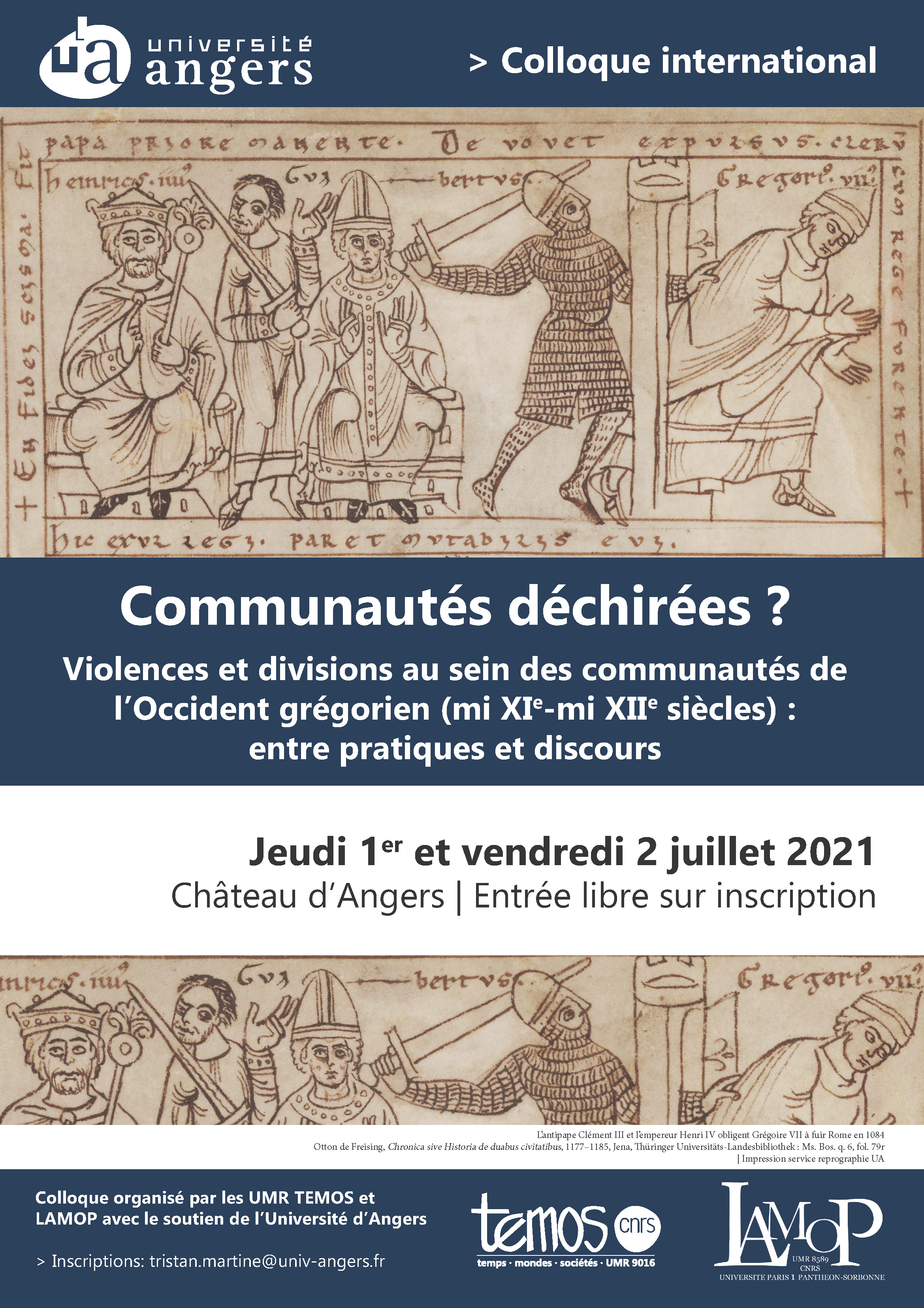 Du milieu du XIe siècle au milieu du XIIe siècle, la « réforme grégorienne » eut de très nombreuses répercussions sociales, culturelles et politiques, à tel point que l’on considère désormais cette période comme un point de rupture entre deux Moyen Âge. Cette rupture est néanmoins appréhendée différemment par les différentes historiographies nationales et l’objectif de cette rencontre est justement d’interroger la violence de ce conflit en s’intéressant à ses conséquences concrètes sur les communautés de l’Occident médiéval. Qu’il s’agisse des communautés ecclésiastiques (curiales, monastiques, canoniales), laïques (urbaines, rurales, guildes) ou encore intellectuelles (textuelles, scripturaires), ce colloque international sera l’occasion de se demander comment celles-ci ont pu être divisées, renforcées ou recomposées par le conflit grégorien.