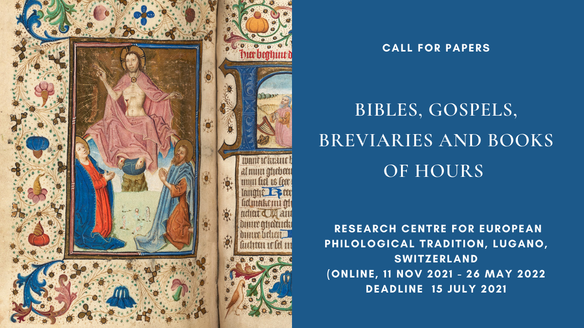Nell’ambito del seminario pubblico dal titolo Bibbie, Vangeli, Breviari e Libri d’Ore, organizzato dal Research Centre for European Philological Tradition (Zurigo, Lugano, Firenze, Roma), che si svolgerà via Zoom ogni giovedì dall’11 novembre 2021 al 26 maggio 2022 e che mira a raccogliere il maggior numero di esperti dell’argomento, lanciamo una call for proposals.
