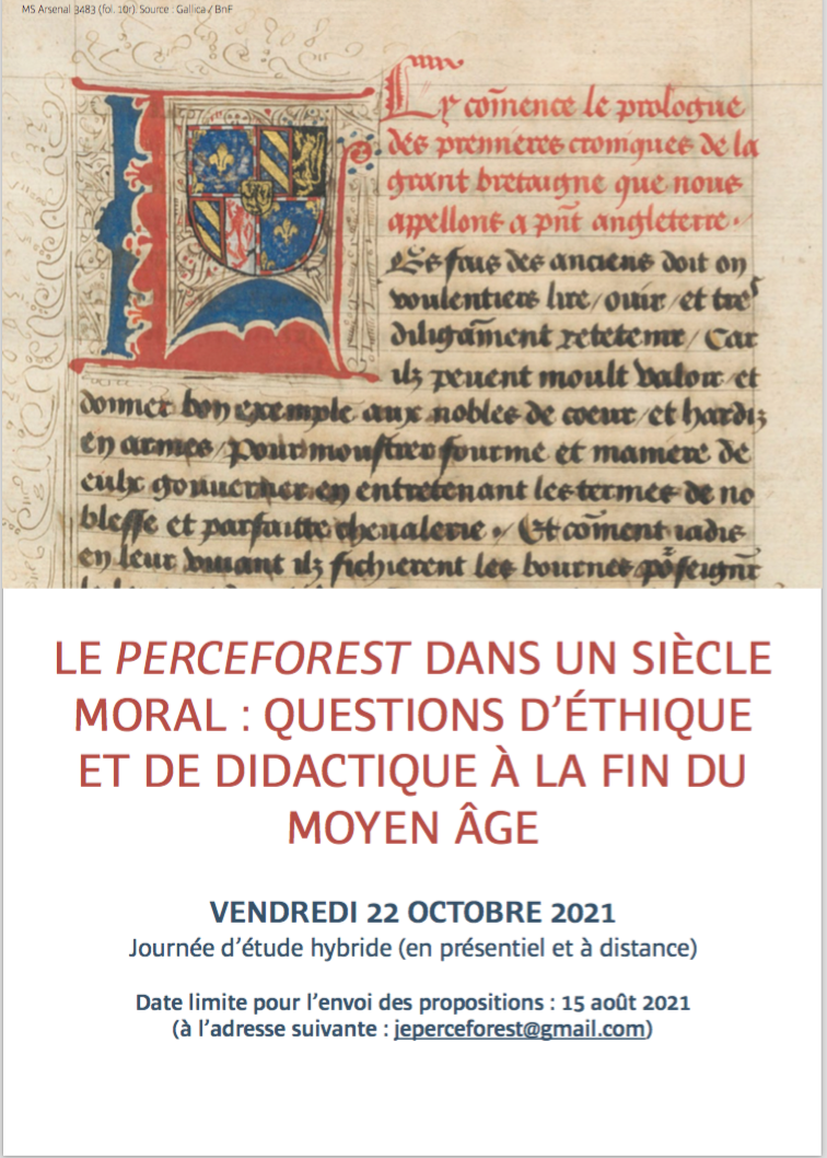 C’est dans ce contexte que le Perceforest doit être envisagé, comme l’œuvre d’un « siècle » (au sens large du terme) où la nostalgie d’un passé arthurien glorieux le dispute à une vision du monde critique et avide de changements, entre ruptures et continuités. C’est donc la volonté de mener une réflexion sur l’insertion du Perceforest dans son temps qui a motivé l’organisation de cette journée d’étude : miroir des princes, mais aussi « delicieuse, melliflue et tres plaisante hystoire », comment le Perceforest nous invite-t-il à penser la création littéraire à la fin du Moyen Âge ?