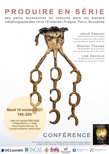 Organisé sur les deux campus, l’évènement sera enrichi d’une soirée à Louvain-la-Neuve, le 19 octobre prochain (18h-20h) : trois conférences sur le thème « Produire en série des petits accessoires du costume dans les ateliers métallurgiques des 14e et 15e siècles » mettront en évidence les pratiques d’atelier et les techniques de production d’ateliers médiévaux dans trois villes européennes : Prague, Paris et Bruxelles. À la fin du Moyen Âge, des ateliers fabriquant des objets de bronze et de laiton s’adaptent à une demande croissante en produisant en série et en masse. Ces conférences proposent d’ouvrir la porte de trois ateliers connus par l’archéologie, de comparer des pratiques, des productions à la mode qui se diffusent partout en Europe, des indices de la rationalisation des productions, à une période où se développe le capitalisme marchand.