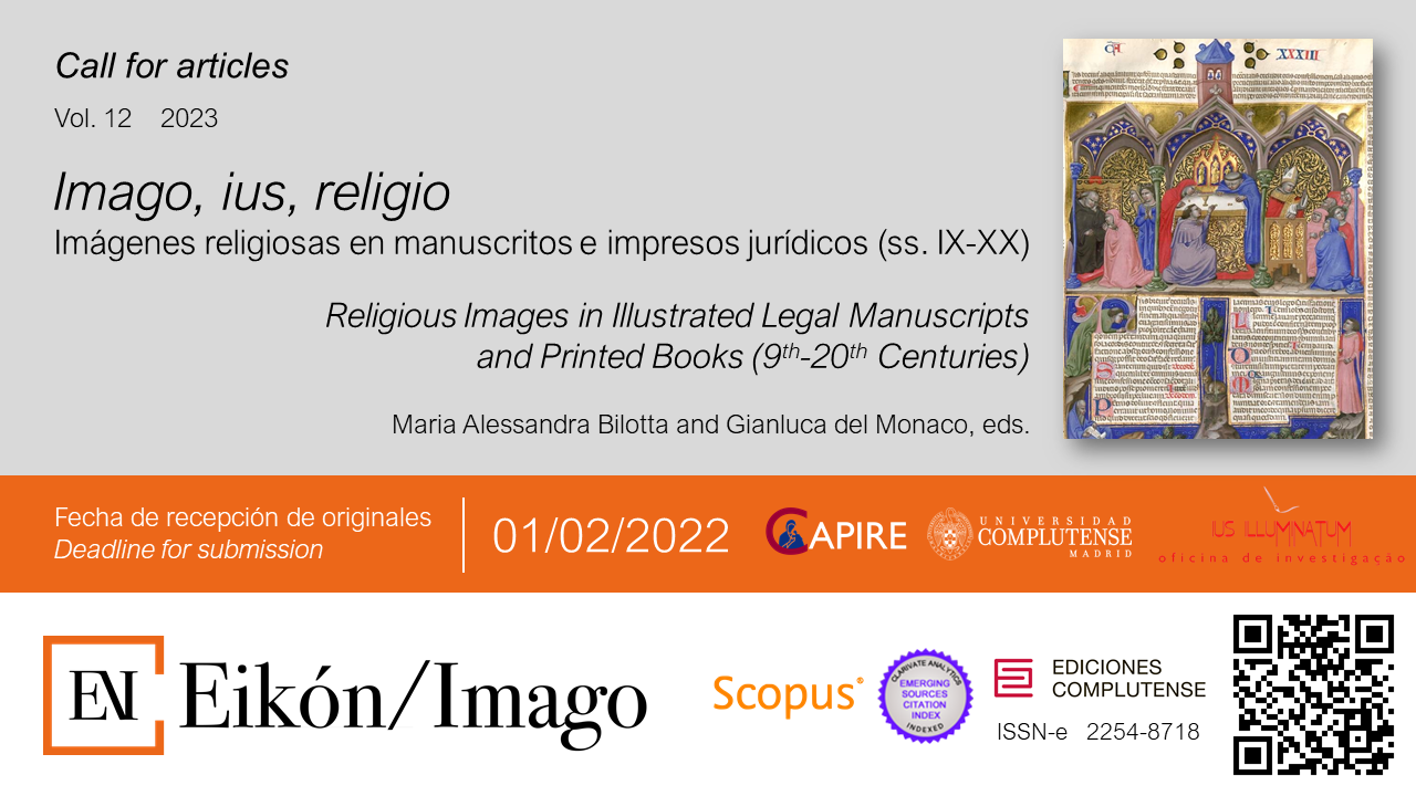 It is not unusual to come across religious iconographies in miniatures as well as borders and based-page scenes in illustrated legal manuscripts and printed books (9th-20th centuries) containing canon, civil or local law texts, like the Livres juratoires or municipal and professional statutes. Some of these iconographies, for instance those in the Decretum Gratiani or the Liber Extra, Gregory IX’s decretals, have been accurately examined. However, a comprehensive survey providing a global and chronological investigation of these depictions is still wanting. Therefore, the journal “Eikon-Imago”, alongside the research team IUS ILLUMINATUM of Institute of Medieval Studies (IEM) of the Faculdade de Ciências Sociais e Humanas at the Universidade NOVA in Lisbon, has decided to devote the 2023 special issue to the study and examination of religious iconographies in legal manuscripts and printed books, so as to create a place for discussion and exchange on the diverse artistic, historical and social aspects of these iconographies.