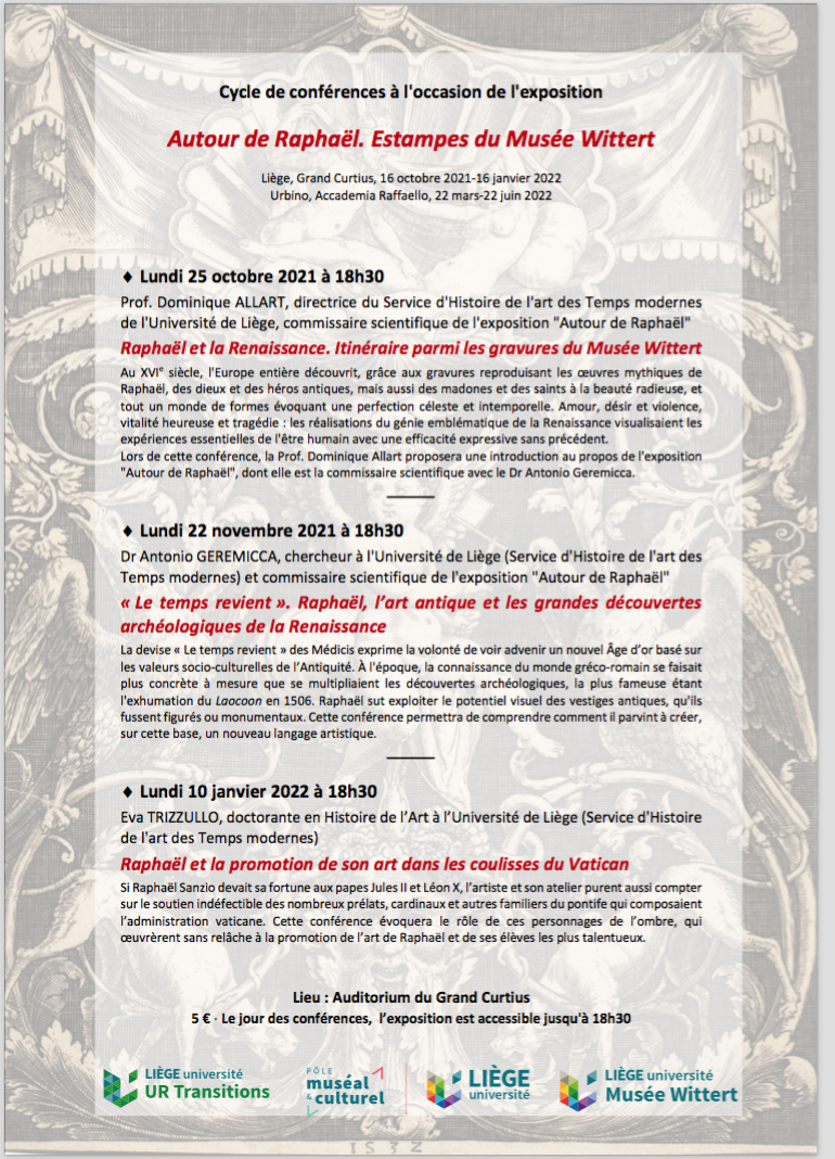 Lors de cette conférence, la Prof. Dominique Allart proposera une introduction au propos de l’exposition « Autour de Raphaël », dont elle est la commissaire scientifique avec le Dr Antonio Geremicca.