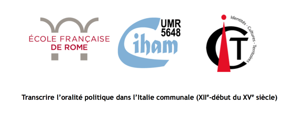 motivations de l’enregistrement, tout comme les biais d’une lecture moderne. Il invite à examiner les pratiques langagières de l’écrit et de l’oral dans leurs dimensions anthropologique, interactionniste et cognitive, en contextualisant les expressions décrites. Il s’agit donc de proposer, à partir d’un champ encore peu investi par l’historiographie, une approche méthodologique pertinente pour éclairer à la fois l’histoire culturelle, l’histoire sociale et l’histoire politique des communes italiennes. Dans ce but, le projet entend réunir des chercheurs et des chercheuses relevant de disciplines complémentaires (histoire, philologie, sciences du langage) autour d’études thématiques. Cet échange permettra de faire interagir les valeurs symboliques et pragmatiques attribuées à la transcription de l’oralité politique, ses usages, de même que la matérialité des documents qui en résultent.