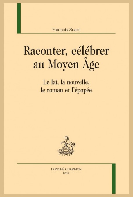 François Suard, Raconter, célébrer au Moyen Âge. Le lai, la nouvelle, le roman et l’épopée, Paris, Honoré Champion, 2021 (Essais sur le Moyen Âge, 77), 402 p., 15 x 23,5 cm. ISBN : 9782745355683. Prix : 65 euros.