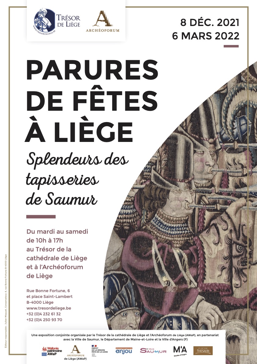 L’exposition « Parures de fêtes à Liège. Splendeurs des tapisseries de Saumur » invite le public belge et étranger à partir à la découverte de la richesse et de la beauté de cet ensemble remarquable et unique de tapisseries (XVe-XXe siècles) provenant principalement du château-musée et des églises de Saumur sur la Loire. Ces 36 tapisseries sont réparties sur les deux sites d’exposition avec un billet d’entrée unique : 30 tapisseries dans cinq salles d’exposition permanente du Trésor de la cathédrale de Liège et 6 tapisseries dans la salle Paul Lohest de l’Archéoforum de Liège
