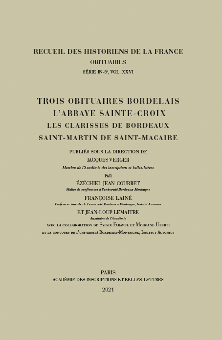 Trois obituaires bordelais. L’abbaye Sainte-Croix, Les Clarisses de Bordeaux, Saint-Martin de Saint-Macaire, éd. Ézéchiel Jean-Courret, Françoise Lainé et Jean-Loup Lemaitre, Paris, AIBL / Peeters, 2021 (Recueil des Historiens de la France: Obituaires. Nouvelle Série, 26). XIV-480 p. ISBN : 9782877546744. Prix : 60 euros.
