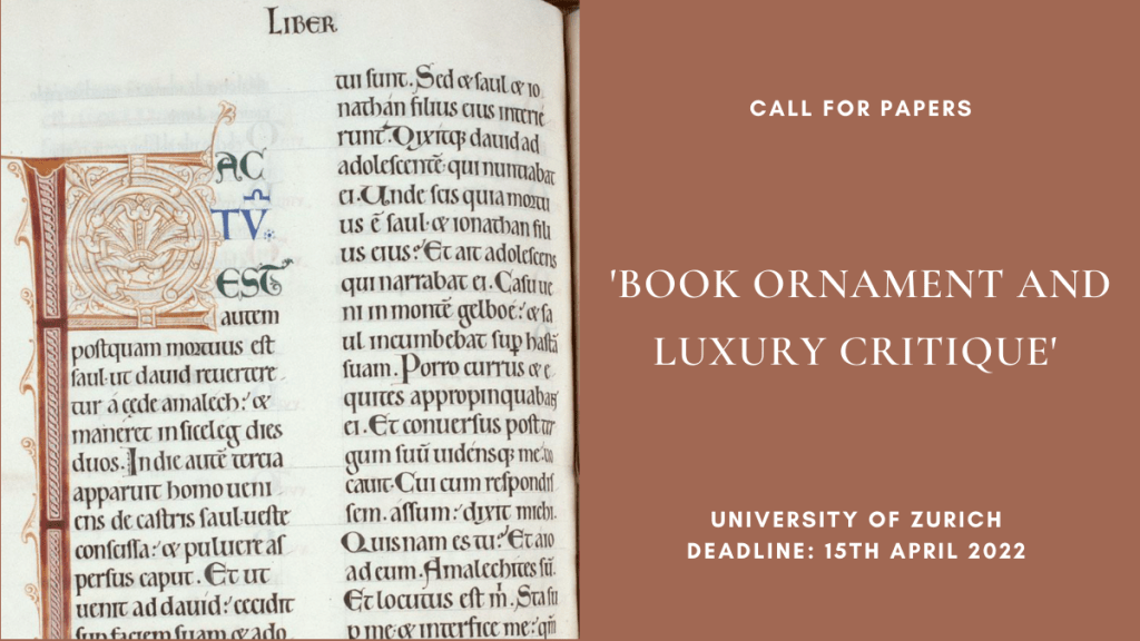 The research group “Textures of Sacred Scripture. Materials and Semantics of Sacred Book Ornament” (https://textures-of-scripture.ch) invites paper proposals for a three-day international conference on “Book Ornament and Luxury Critique”. The conference, funded by the Swiss National Science Foundation, is scheduled to take place at the Institute of Art History at the University of Zurich from 15 to 17 September 2022.