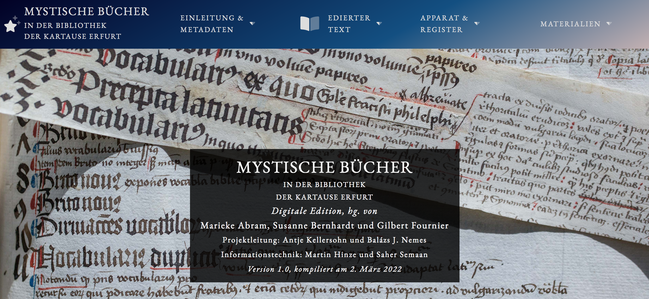 Mystische Bücherin der Bibliothek der Kartause Erfurt. Digitale Edition, hg. vonMarieke Abram, Susanne Bernhardt und Gilbert FournierProjektleitung: Antje Kellersohn und Balázs J. NemesInformationstechnik: Martin Hinze und Saher SemaanVersion 1.0, kompiliert am 2. März 2022