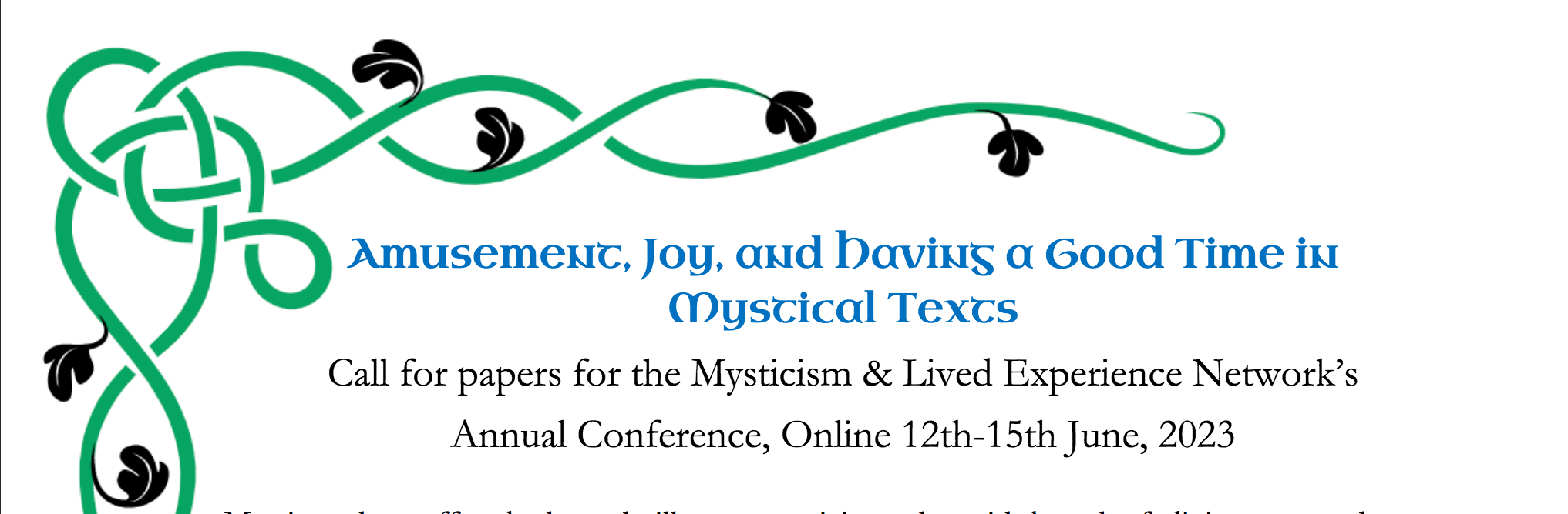With this in mind, we seek proposals for 15-20-minute papers, exploring the theme of amusement, joy, and having a good time in mystical texts, as well as for a chapter on the same them. Please submit abstracts for each, of up to 500wordseach, along with a brief biographyto AJLangley and Einat Klafter at lifeandmystics@gmail.com by 7 October 2022.