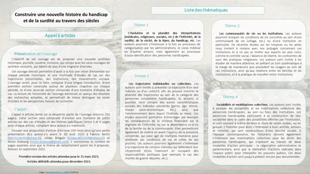 L’évolution et la pluralité des interprétations (médicales, religieuses, sociales, etc.) de l’infirmité, de la surdité, de la cécité, de la lèpre, du handicap, etc. Les auteurs pourront s’intéresser à la fois au processus de catégorisation par les administrations, le corps médical ou d’autres acteurs, mais également au processus d’auto-identification des personnes handicapées.