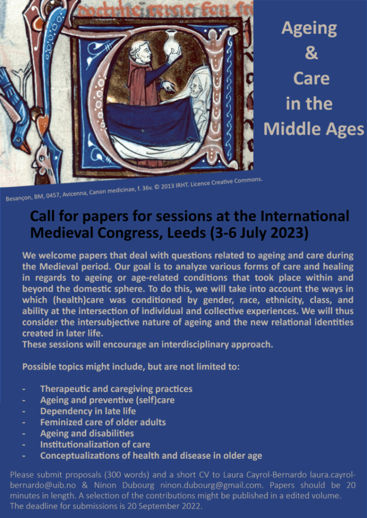 We welcome papers that deal with questions related to ageing and care during the Medieval period. Our goal is to analyze various forms of care and healing in regards to ageing or age-related conditions that took place within and beyond the domestic sphere. To do this, we will take into account the ways in which (health)care was conditioned by gender, race, ethnicity, class, and ability at the intersection of individual and collective experiences. We will thus consider the intersubjective nature of ageing and the new relational identities created in later life.