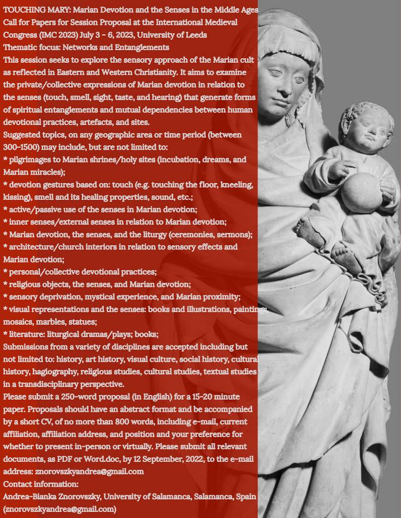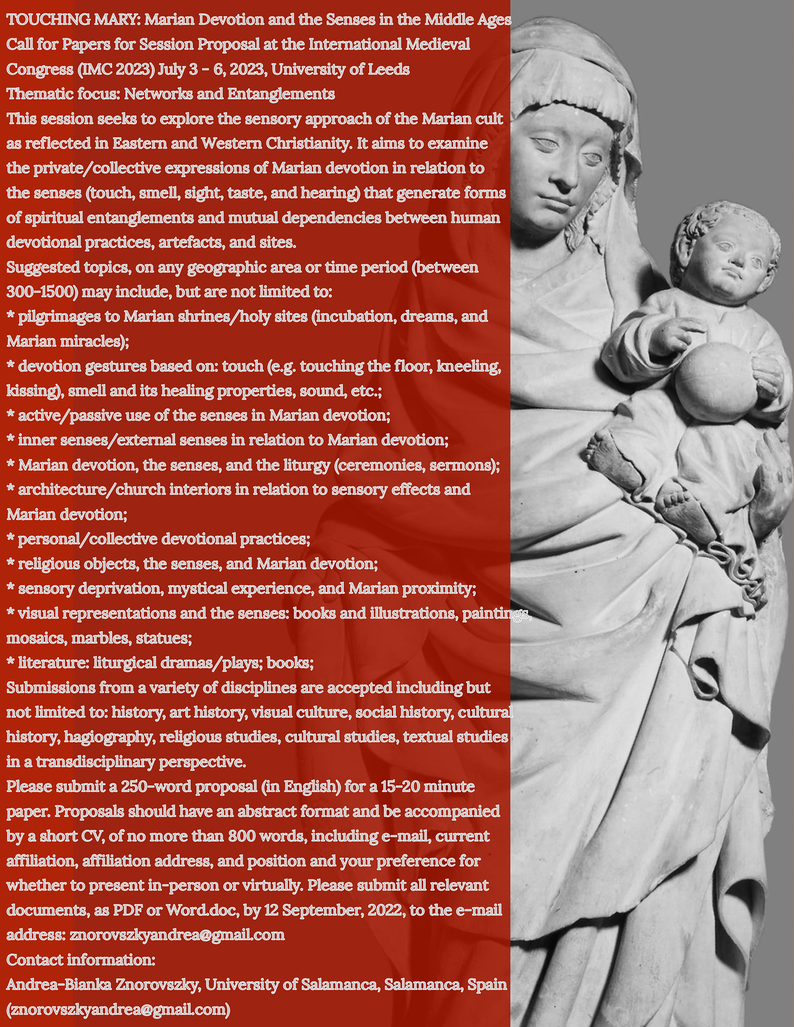 This session seeks to explore the sensory approach of the Marian cult as reflected in Eastern and Western Christianity. It aims to examine the private/collective expressions of Marian devotion in relation to the senses (touch, smell, sight, taste, and hearing) that generate forms of spiritual entanglements and mutual dependencies between human devotional practices, artefacts, and sites.