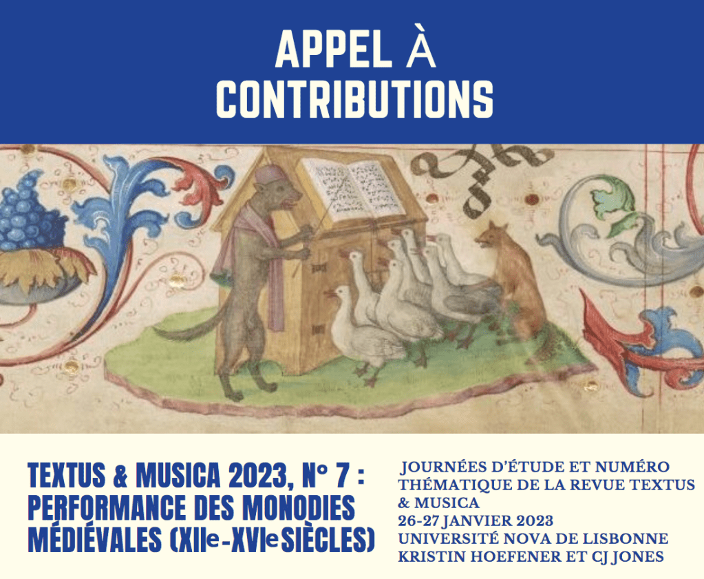 La revue franco-italienne Textus & Musica lance un appel à contribution pour des journées d’étude et un numéro spécial de la revue qui porteront sur la performance des monodies médiévales (liturgiques, sacrées ou profanes). Nous acceptons des propositions qui abordent une grande variété de sources écrites et visuelles, européennes et extra-européennes, jusqu’au Moyen Âge tardif (XIIe-XVIe siècle).