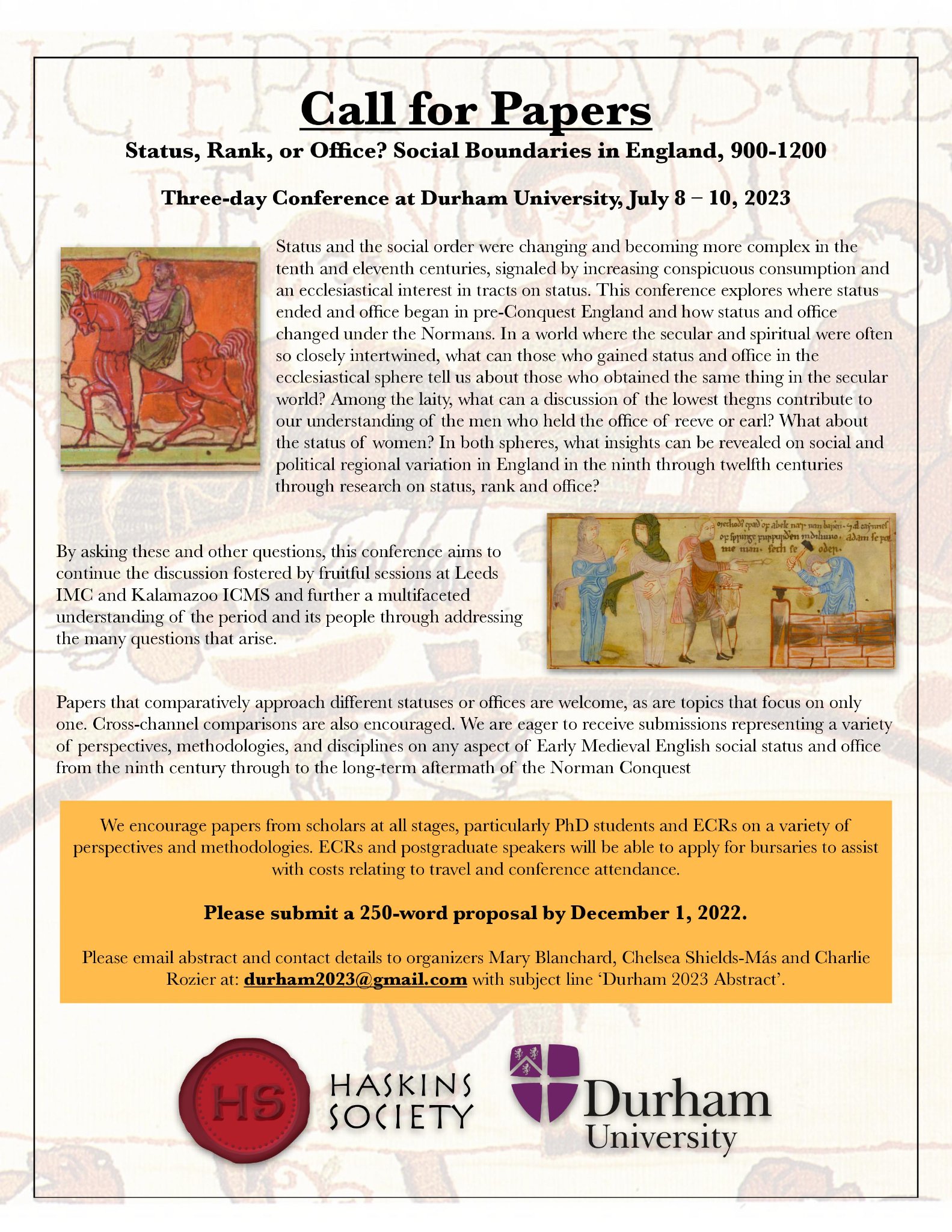 « Status, Rank, or Office? Social Boundaries in England, 900-1200, » a 3-day conference at Durham University, July 8–10, 2023