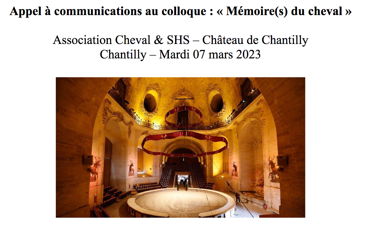 Merci d’envoyer vos propositions de communications, dans la limite de 500 caractères (espaces compris), assorties d’une courte biographie, à l’adresse mail suivante : cheval.shs@gmail.com, avant le 30 septembre 2022, avec l’objet “Colloque Chantilly 2023”.
