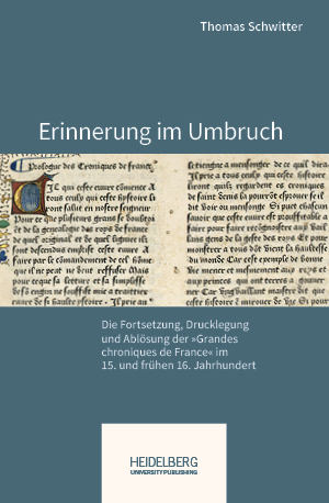 Thomas Schwitter, Erinnerung im Umbruch. Die Fortsetzung, Drucklegung und Ablösung der Grandes chroniques de France im 15. und frühen 16. Jahrhundert, Heidelberg, Heidelberg University Publishing, 2022 ; 1 vol., 334 p. (Pariser Historische Studien). ISBN : 978-3968220925. Prix : € 49,90.