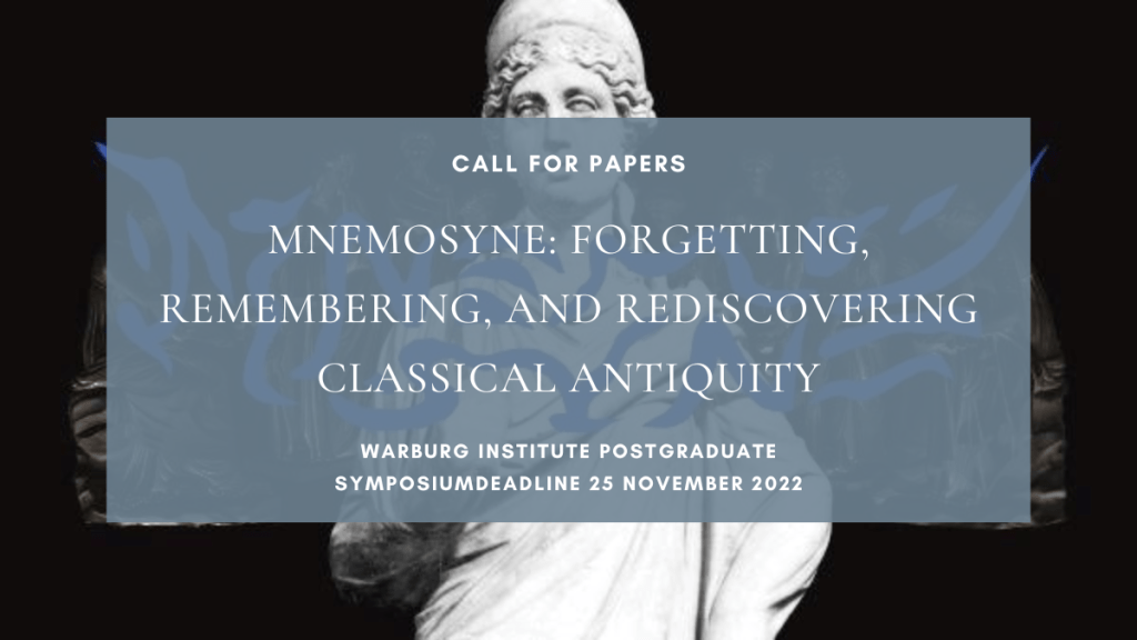 The Warburg Institute, in collaboration with the Institute of Classical Studies, is hosting its fourth Postgraduate Symposium, Mnemosyne: Forgetting, Remembering, and Rediscovering Classical Antiquity. This is an in-person event for postgraduate students and early-career researchers held in central London.