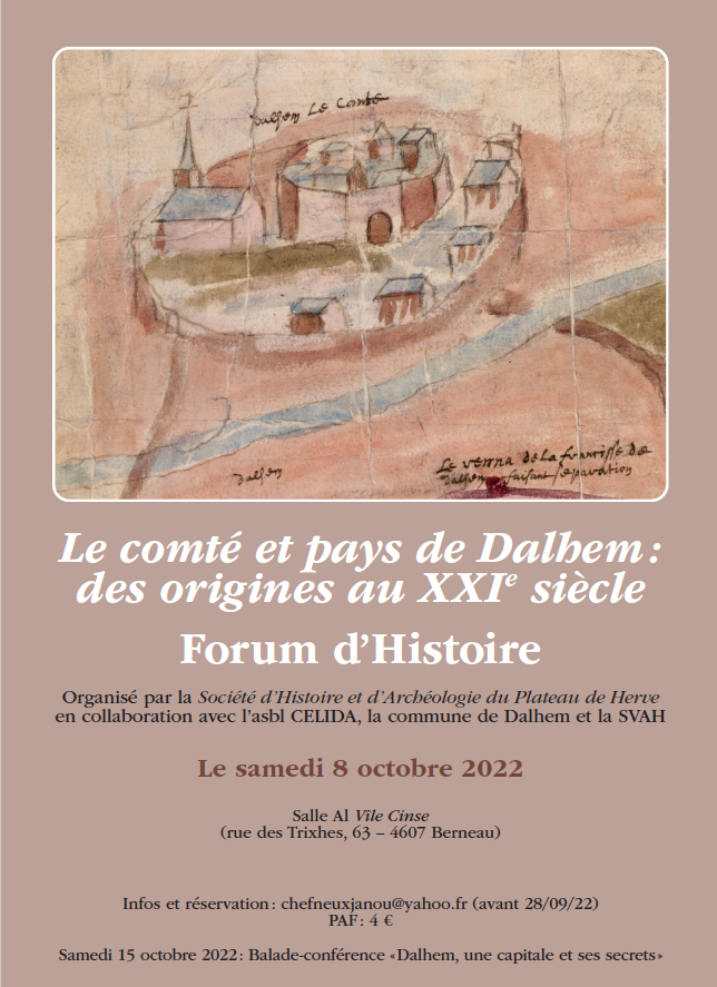 Ce Forum est organisé par la Société d’Histoire et d’Archéologie du Plateau de Herve, en collaboration avec Asbl Celida c/o Archives de l’État à Liège, la Commune de Dalhem – Page de l’administration communale et la Société verviétoise d’Archéologie et d’Histoire.