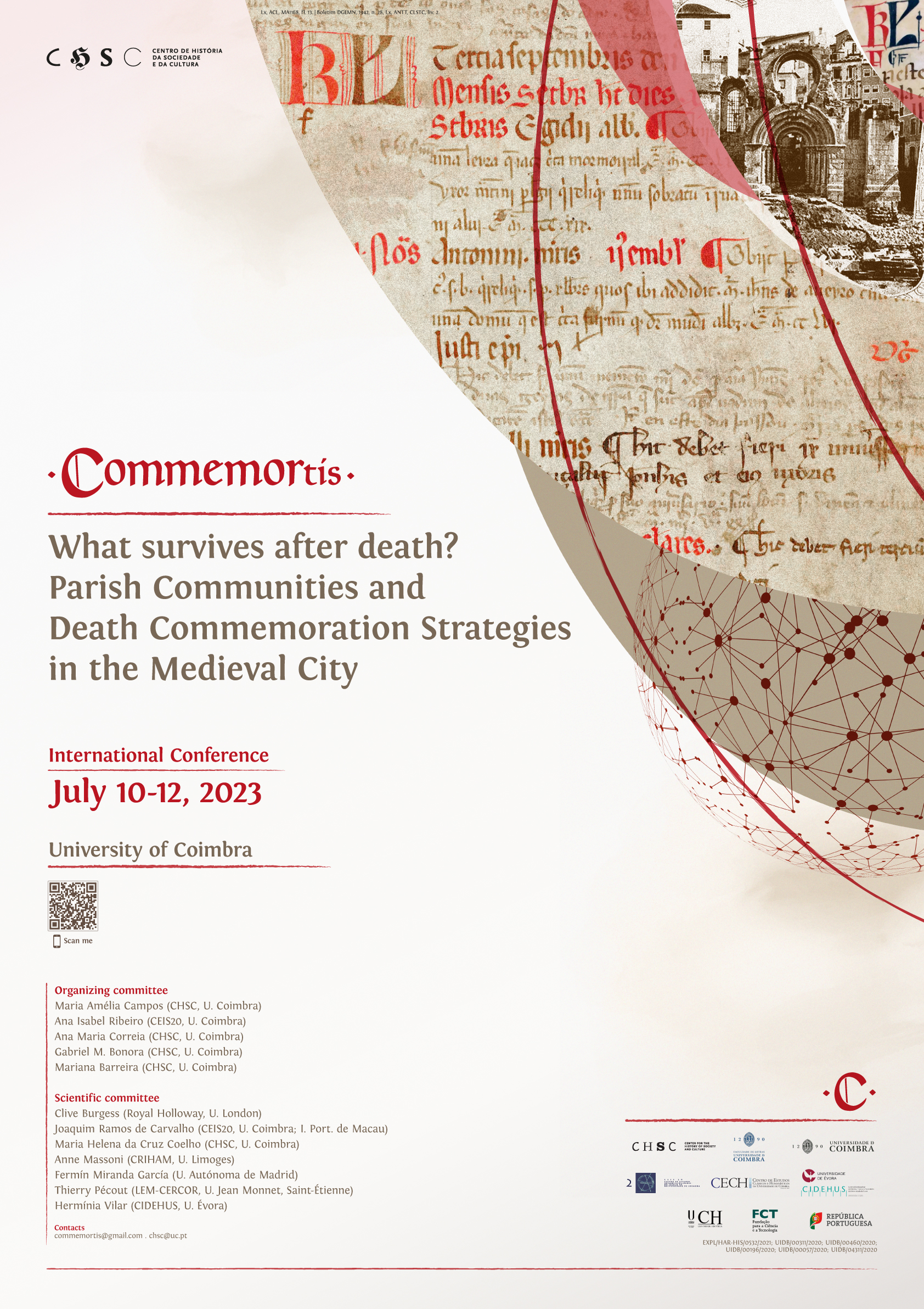 This international conference will be held in the frame of the exploratory research project COMMEMORtis – What survives after death? Parish communities and death commemoration strategies in the medieval city EXPL/HARHIS/0532/2021, funded by Portuguese funds (PIDDAC), through FCT (Portuguese national funding agency for science, research and technology) (I.P./MCTES), hosted in the Centre for History of Society and Culture (UIDB/00311/2020 and UIDP/00311/2020), coordinated by Maria Amélia Campos (DL57/2016/CP1370/CT0068).