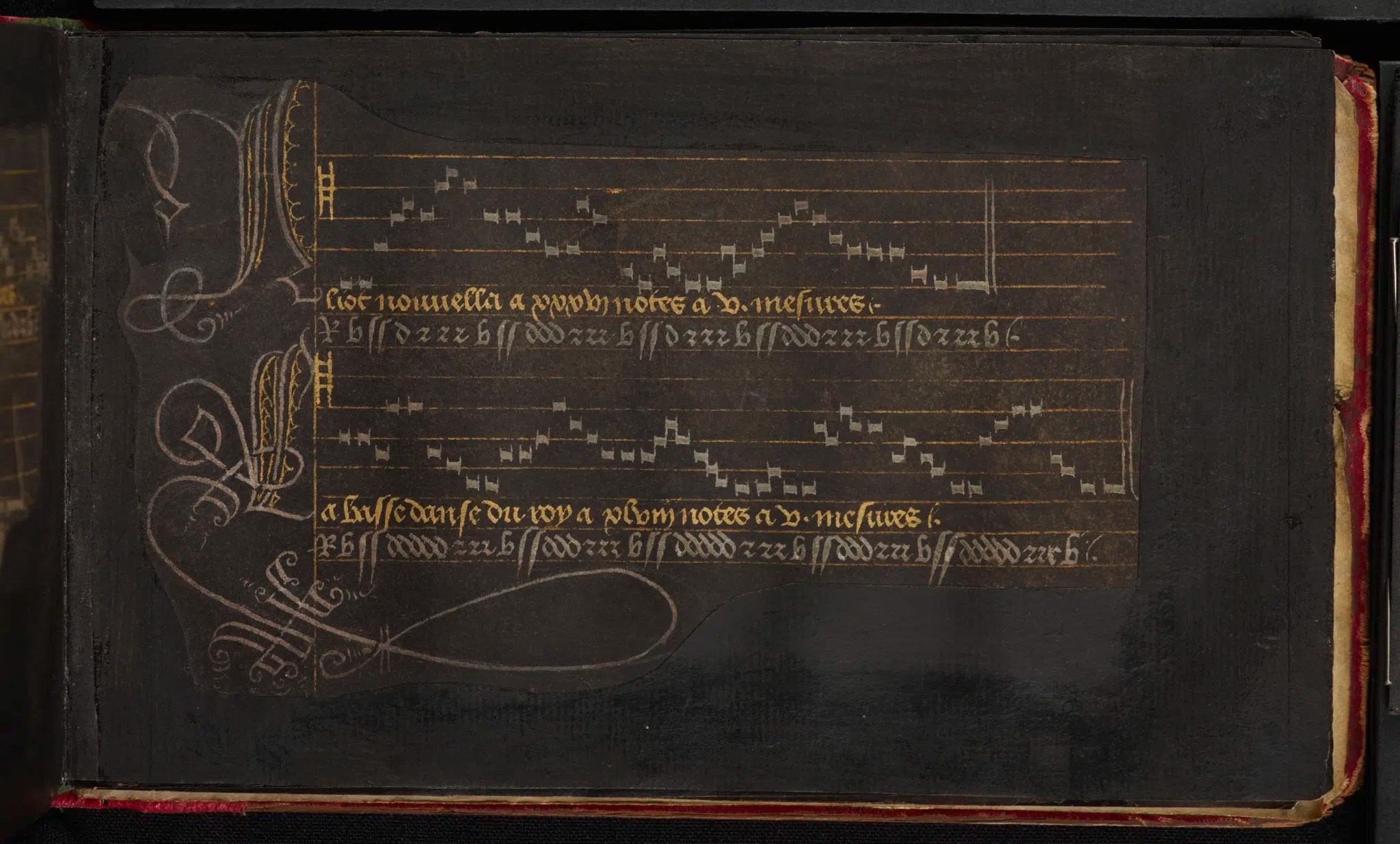 Les manuscrits du Moyen Âge sont par définition uniques et très précieux. Mais avec leurs 25 feuillets de couleur noire, les basses danses revêtent un caractère particulièrement exceptionnel. À la cour de Bourgogne, la couleur noire est le symbole du luxe et du prestige. De plus, les notes et les mots rédigés à l’encre dorée et argentée, brillent de mille feux et donnent encore plus de majesté à ce manuscrit.