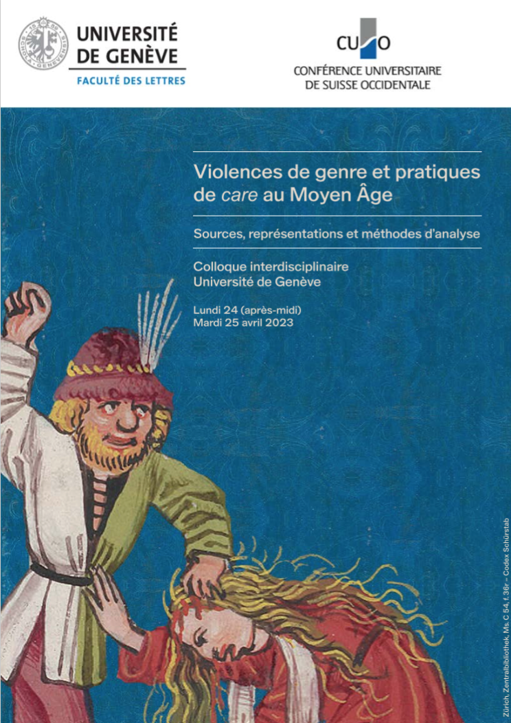 Dans le cadre du programme doctoral d’études médiévales de la CUSO, nous avons le plaisir d’organiser, les lundi 24 (après-midi) et mardi 25 avril 2023, à l’Université de Genève, un colloque interdisciplinaire sur les représentations de la violence basée sur le genre et sur les pratiques de soin qui y répondent au Moyen Âge.