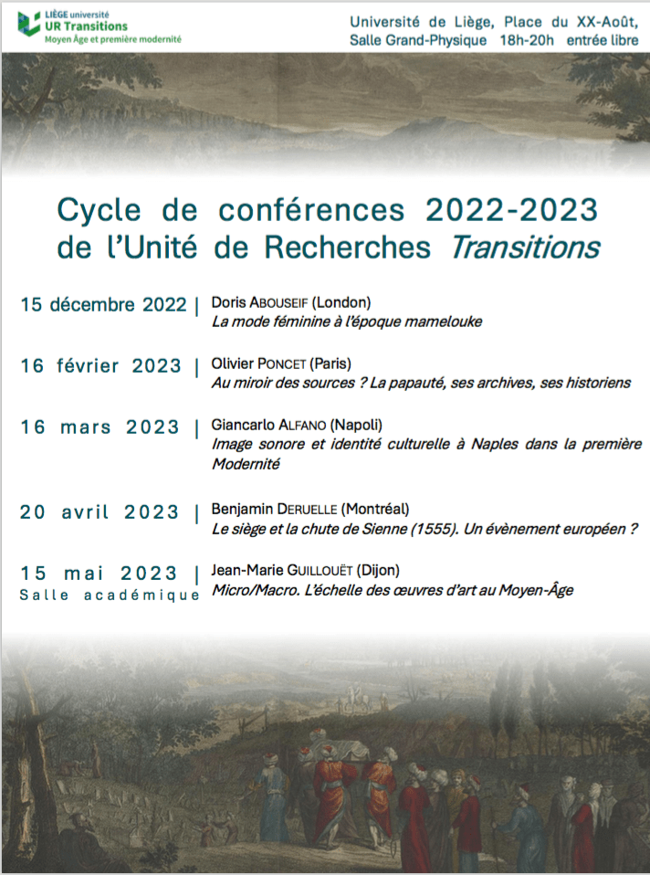 - Jeudi 20 avril 2023, Benjamin Deruelle (Université du Québec, Montréal), « Le siège et la chute de Sienne (1555) : un événement européen ? ».