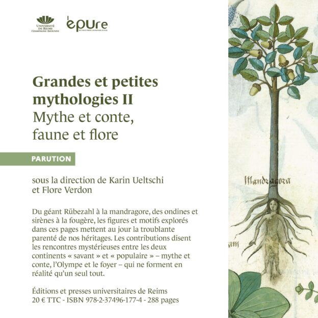 Grandes et petites mythologies, t. 2, Mythe et conte, faune et flore, éd. Karin Ueltschi et Flore Verdon, Reims, EPURE, 2022 ; 1 vol., 400 p. ISBN : 978-2-37496-177-4. Prix : € 20,00.