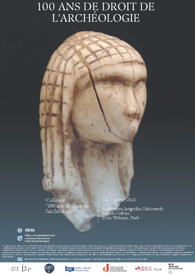 Les 5 et 6 janvier 2023, un colloque interdisciplinaire – « 100 ans de droit de l’archéologie » – engagera une réflexion scientifique sur la genèse et les évolutions du droit de l’archéologie à l’occasion des 80 ans de la loi 27 septembre 1941 portant réglementation des fouilles archéologiques et des 20 ans de la loi du 17 janvier 2001 sur l’archéologie préventive.