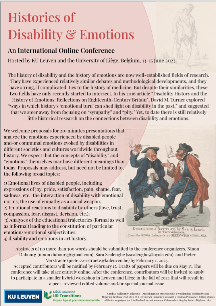 We welcome proposals for 20-minutes presentations that analyze the emotions experienced by disabled people and/or communal emotions evoked by disabilities in di erent societies and cultures worldwide throughout history. We expect that the concepts of “disability” and “emotions” themselves may have di erent meanings than today. Proposals may address, but need not be limited to, the following broad topics: