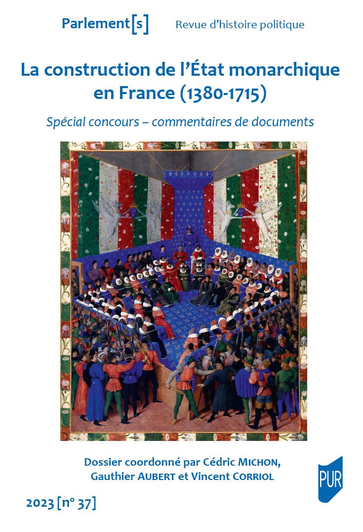 La construction de l’État monarchique en France (1380-1715). Spécial concours – commentaires de documents, dir. Cédric Michon, Gauthier Aubert, Vincent Corriol, Parlement[s]. Revue d’histoire politique, t. 37, 2023/1 ; 1 vol., 268 p.