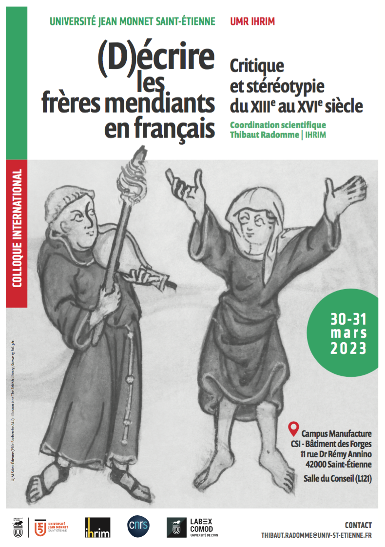 Dès le milieu du XIIIe siècle, les frères mendiants sont confrontés, au sein de l’Université de Paris, à l’hostilité des maîtres séculiers. Or, cet antifraternalisme d’origine savante se répand très tôt dans la littérature vernaculaire, où il se transforme en une critique généraliste et essentialisante : accusés d’aimer l’argent tout en prétendant aspirer à la pauvreté évangélique, les frères mendiants sont dépeints comme l’incarnation du vice d’hypocrisie. Le présent colloque vise donc à interroger les conditions dans lesquelles le discours anti-Mendiants a dépassé le cercle restreint de la polémique universitaire pour gagner la littérature en langue française et y forger le stéréotype, extrêmement puissant et durable, du frère mendiant hypocrite.