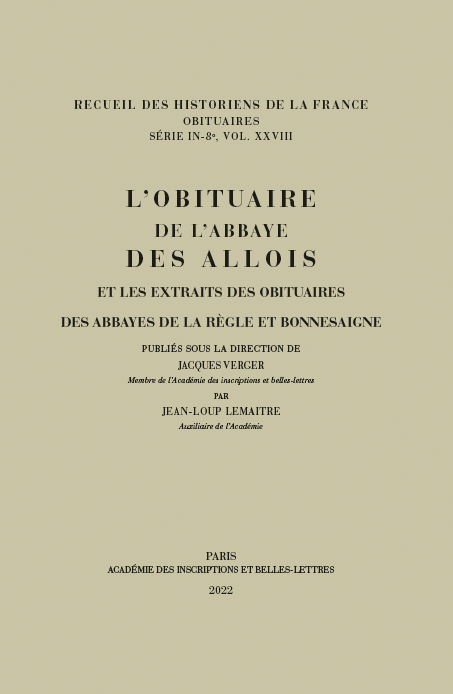 L’obituaire de l’abbaye des Allois et les extraits des obituaires des abbayes de la Règle et Bonnesaigne, éd. Jean-Loup Lemaître, Paris, Académie des Inscriptions et Belles-Lettres, 2023 ; 1 vol., VIII–202 p. (Recueil des Historiens de la France: Obituaires. Nouvelle Série, 28). ISBN : 978-2-87754-694-2. Prix : € 40,00.