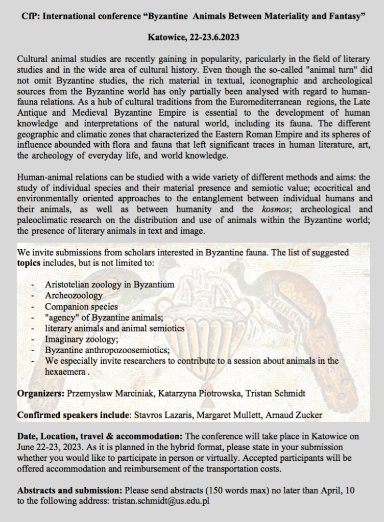 We invite submissions from scholars interested in Byzantine fauna. The list of suggested topics includes, but is not limited to: