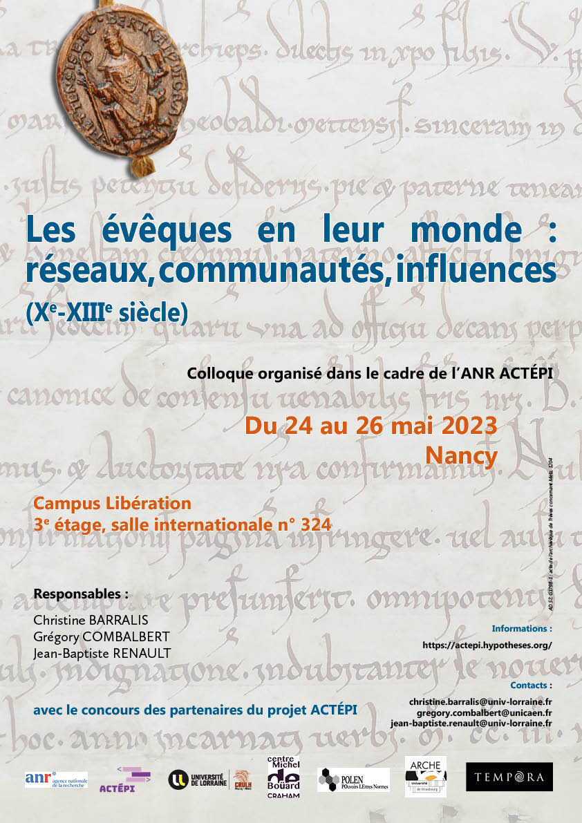 Le rassemblement en corpus et l’édition critique des actes épiscopaux, en cours depuis le début du projet ACTÉPI, pour une quinzaine de diocèses des provinces de Tours, Rouen, Reims, Bourges, Sens et Trèves, permet de disposer de sources d’une très grande richesse pour appréhender les évêques, leur action et leurs interactions. C’est précisément cette question des interactions, entendue dans une perspective large, qui sera placée au coeur du colloque de Nancy. L’objectif est d’identifier les individus et les institutions qui sont en relation avec les évêques, en tentant de comprendre la nature et l’ampleur ces relations, ainsi que leurs modalités pratiques : sont-elles institutionnelles ou personnelles, hiérarchisées ou collégiales, structurées ou informelles, constructives ou conflictuelles ? Il s’agit aussi d’étudier les directions dans lesquelles elles se déploient et les actions au service desquelles elles se nouent et sont entretenues.