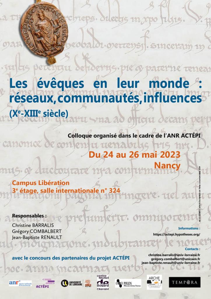 Le colloque qui aura lieu à Nancy du 24 au 26 mai 2023 est le deuxième colloque organisé dans le cadre du projet ANR ACTÉPI – « Les actes épiscopaux français du Moyen Âge : édition multimodale et exploitation », après le colloque d’Orléans consacré aux actes d’évêques, en juin 2022.