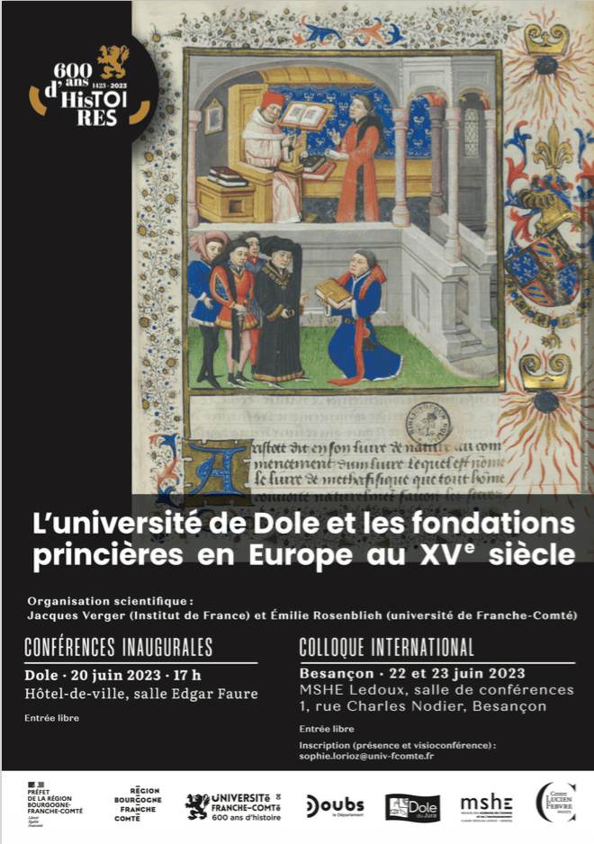 Le colloque s’ouvrira le 22 juin 2023, jour anniversaire de la création d’une université à Dole, le 22 juin 1423, par le duc de Bourgogne Philippe le Bon avec l’accord du pape Martin V. Pour commémorer les 600 ans de l’université de Franche-Comté, il sera précédé, le 20 juin à Dole, berceau de l’université, de conférences inaugurales devant un plus large public. Le programme scientifique propose une réflexion comparatiste sur le mouvement des fondations princières qui caractérise l’Europe du XVe siècle. Il compare l’université de Dole à celle de Louvain – bientôt insérée dans la Grande Principauté bourguignonne – et à d’autres universités : Turin en Piémont, Nantes en Bretagne, Valence en Dauphiné, Tübingen en Wurtemberg, etc.