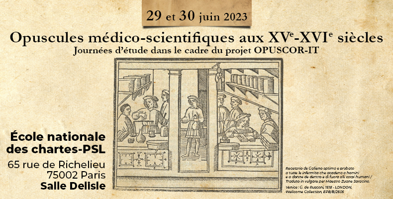 Les journées d’étude Opuscules médico-scientifiques aux XVe et XVIe siècles, organisées dans le cadre du projet OPUSCOR-IT se proposent d’approfondir, dans une optique interdisciplinaire (philologie, histoire du livre, histoire des sciences, histoire de l’art), les problématiques liées à la production de livrets éphémères sur les savoirs et les pratiques liés au corps et à la santé qui se diffusent dès l’aube de l’imprimerie.