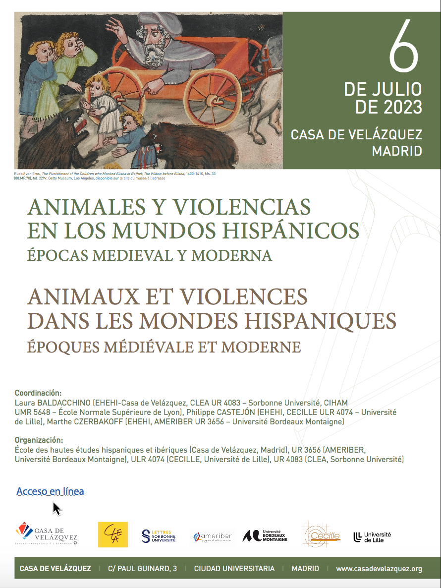 L’objectif de la rencontre interdisciplinaire est ainsi d’explorer l’usage de l’animal en tant que symbole, objet ou instrument de la violence des hommes dans le monde hispanique médiéval et moderne. En étudiant les animaux, dans leurs réalités maté- rielles ou leurs représentations, à l’aune du concept de violence, la journée invite enfin à repenser leur place dans les sociétés du passé en accordant une importance aux continuités et aux ruptures.