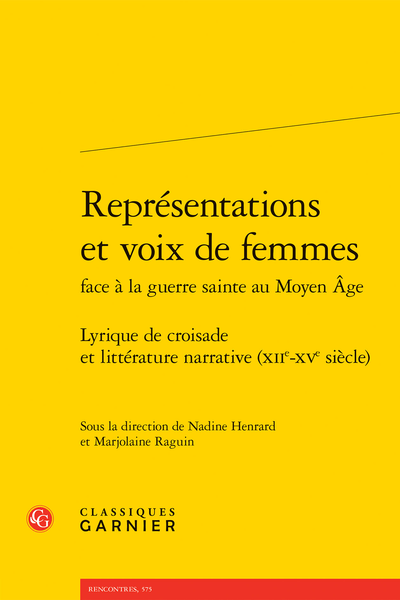 Représentations et voix de femmes face à la guerre sainte au Moyen Âge. Lyrique de croisade et littérature narrative (XIIe-XVe siècle), éd. Nadine Henrard, Marjolaine Raguin, Paris, Classiques Garnier, 2023 ; 1 vol., 422 p. (Rencontres, 575 ; Civilisation médiévale, 53). ISBN : 978-2-406-14606-3. Prix :€ 32,00.