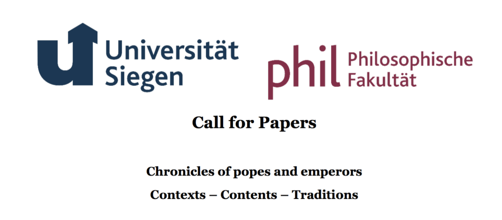 The conference is organised by the Department of Medieval and Early Modern History at University of Siegen. It will take place on 7-8 June 2024 as a hybrid conference (on site in Siegen and via Webex). Interested researchers from the historical sciences and other disciplines such as literary studies or art history are encouraged to submit an abstract of max. 250 words for a presentation of approx. 25-minute on a single or a bundle of chronicles of popes and emperors (or works with only one of the two strands) in German, English, Italian, French or Spanish to giuseppe.cusa(at)uni-siegen.de by 30 September 2023. The papers will be selected by mid-October 2023. The costs for travel and accommodation most probably can be covered only in part. A publication of the conference papers is planned—subject to the positive evaluation of the conference.