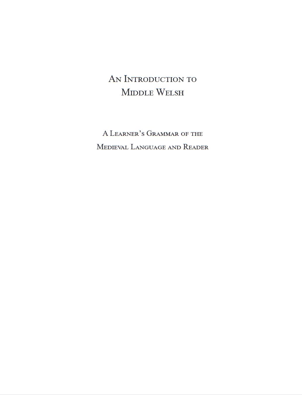 An Introduction to Middle Welsh: A Learner’s Grammar of the Medieval Language and Reader presents a complete course in reading Middle Welsh. The course is intended both for those who are working with a teacher and for self-learners, and assumes no prior knowledge of any Celtic language. A Learner’s Grammar introduces the grammatical constructions and vocabulary required for the person who wishes to read medieval Welsh prose, with exercises from authentic Welsh texts in each unit. The Reader in the second part presents long excerpts from texts from medieval Welsh literature and history. A full Glossary is included.