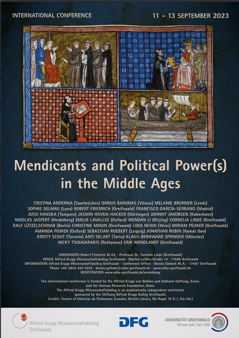 This international conference will assess these relationships between potentates and mendicant orders by bringing together internationally renowned scholars to explore this field of interaction between religion and politics in late medieval Europe from a comprehensive comparative perspective for the very first time. In addition to the actual connections between orders and rulers, representations and ideas of these links to power will also be examined. For this purpose, papers will draw on, for instance, sermons and visions, thus taking into consideration two important genres for the popular communication of knowledge, news, and ideas in the Middle Ages. With this conference, we hope to generate new insights into such diverse fields as the history of political ideas, of religious orders, of diplomacy, of piety, and of rulership more broadly.