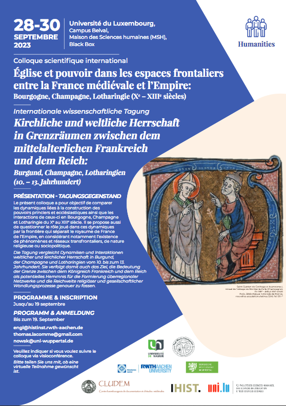 - 17.30 Michel Margue (Université du Luxembourg) : Au-delà des frontières, au cœur des réseaux. Fondations religieuses et fondateurs laïques au XIIe siècle entre Lotharingie, Champagne et Bourgogne