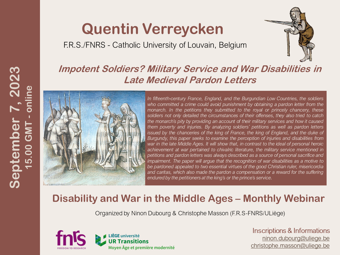 In fifteenth-century France, England, and the Burgundian Low Countries, the soldiers who committed a crime could avoid punishment by obtaining a pardon letter from the monarch. In the petitions they submitted to the royal or princely chancery, these soldiers not only detailed the circumstances of their offenses, they also tried to catch the monarch’s pity by providing an account of their military services and how it caused them poverty and injuries. By analyzing soldiers’ petitions as well as pardon letters issued by the chanceries of the king of France, the king of England, and the duke of Burgundy, this paper seeks to examine the perception of injuries and disabilities from war in the late Middle Ages. It will show that, in contrast to the ideal of personal heroic achievement at war pertained to chivalric literature, the military service mentioned in petitions and pardon letters was always described as a source of personal sacrifice and impairment. The paper will argue that the recognition of war disabilities as a motive to be pardoned appealed to two essential virtues of the good Christian ruler, misericordia and caritas, which also made the pardon a compensation or a reward for the suffering endured by the petitioners at the king’s or the prince’s service.