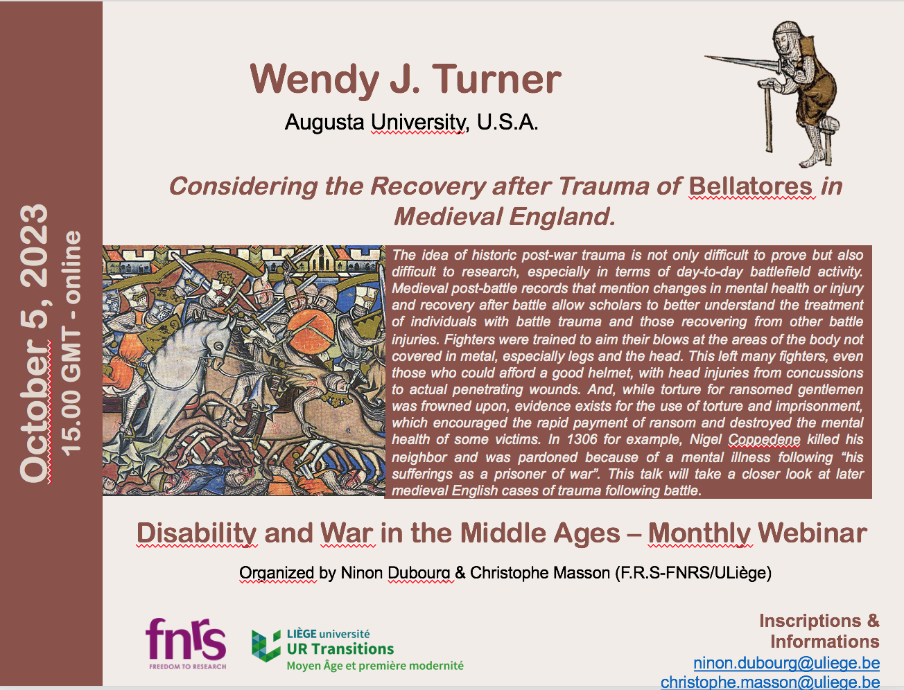 The idea of historic post-war trauma is not only difficult to prove but also difficult to research, especially in terms of day-to-day battlefield activity. Medieval post-battle records that mention changes in mental health or injury and recovery after battle allow scholars to better understand the treatment of individuals with battle trauma and those recovering from other battle injuries. Fighters were trained to aim their blows at the areas of the body not covered in metal, especially legs and the head. This left many fighters, even those who could afford a good helmet, with head injuries from concussions to actual penetrating wounds. And, while torture for ransomed gentlemen was frowned upon, evidence exists for the use of torture and imprisonment, which encouraged the rapid payment of ransom and destroyed the mental health of some victims. In 1306 for example, Nigel Coppedene killed his neighbor and was pardoned because of a mental illness following “his sufferings as a prisoner of war”. This talk will take a closer look at later medieval English cases of trauma following battle.