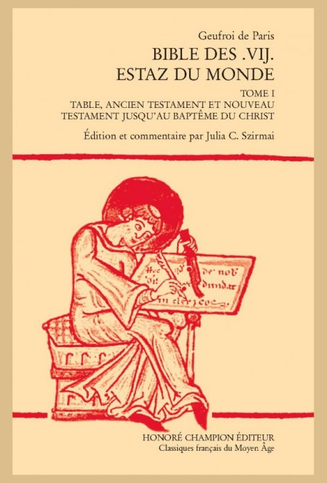 Geufroi de Paris, Bible des .VII. estaz du Monde, t. 1, Table, ancien testament et nouveau testament jusqu’au baptême du Christ, éd. Julia C. Szirmai, Paris, Honoré Champion, 2023 ; 1 vol., 466 p. (Classiques français du Moyen Âge, 201). ISBN : 978-2-74535-976-6. Prix : € 48,00.
